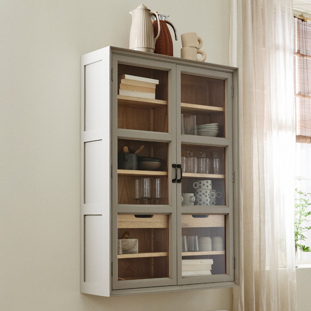 Ontdek de aan de muur gemonteerde VIVA vitrinekast in de nieuwe grijze kleur – een unieke combinatie van functionaliteit en tijdloze elegantie voor uw huis