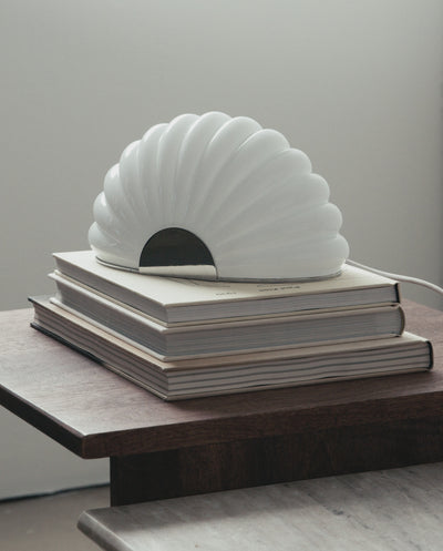 The lamp's sculptural arch, with its grooves, references a seashell. It is designed with a milky white glass shade that emits a soft diffuse light. The lamp's base is crafted in chrome, adding a touch of elegance. With its organic form and subdued light source, the lamp appears as both a sculpture and a lamp in your home.